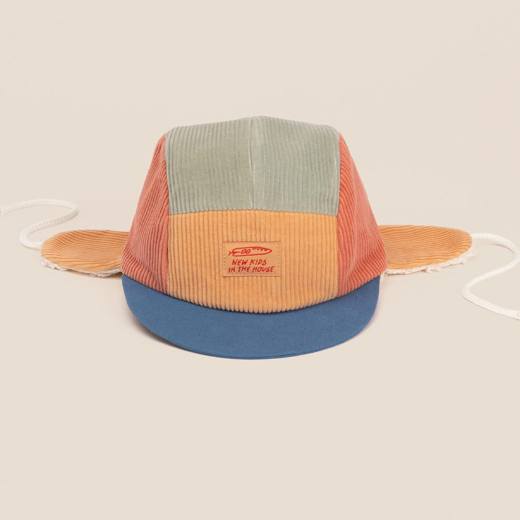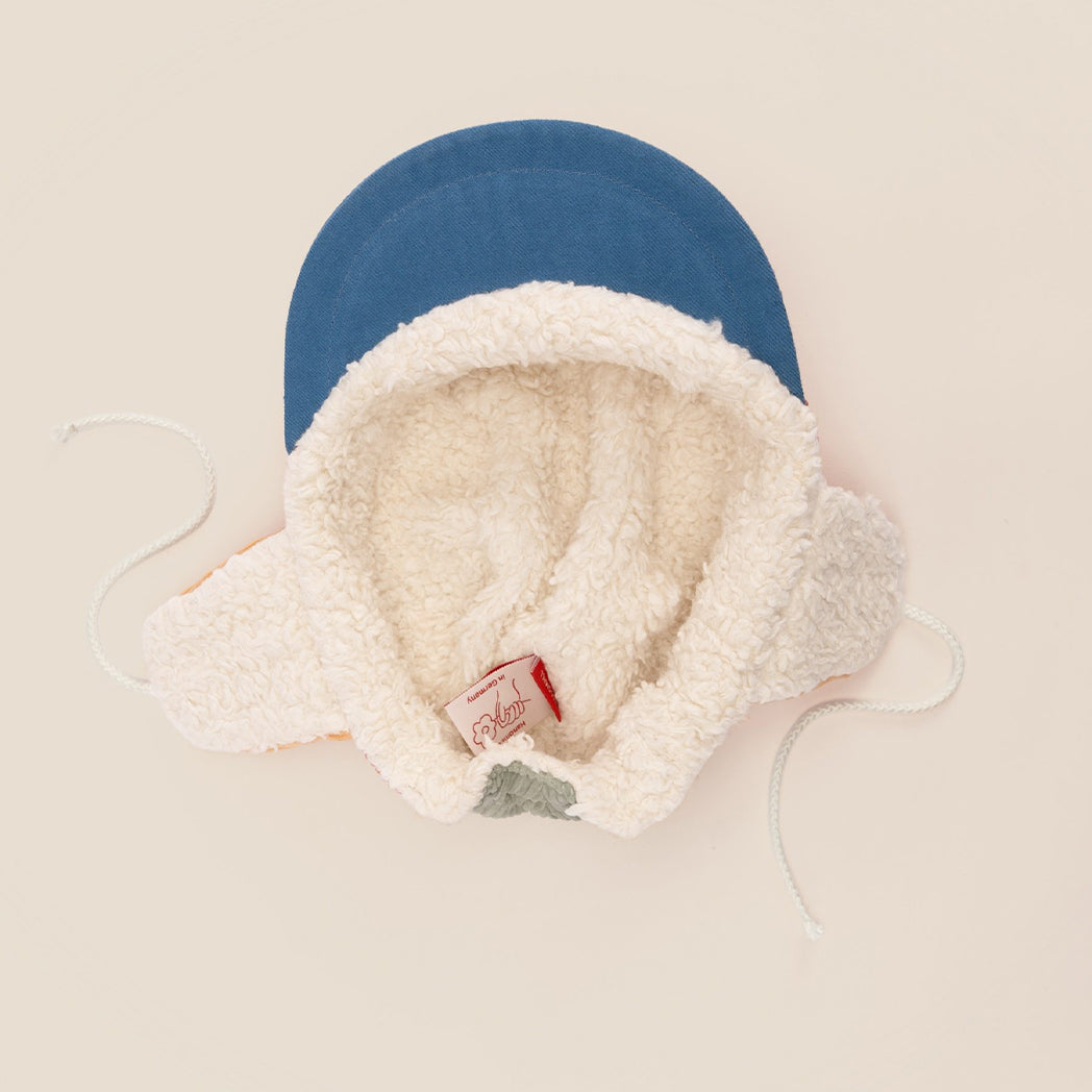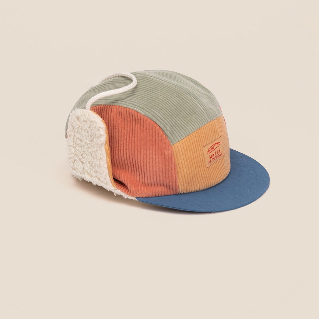 Gefütterte 5-Panel Mütze in Hellgrün, Gelb, Orange und Blau Tönen mit Ohrenklappen zum binden.