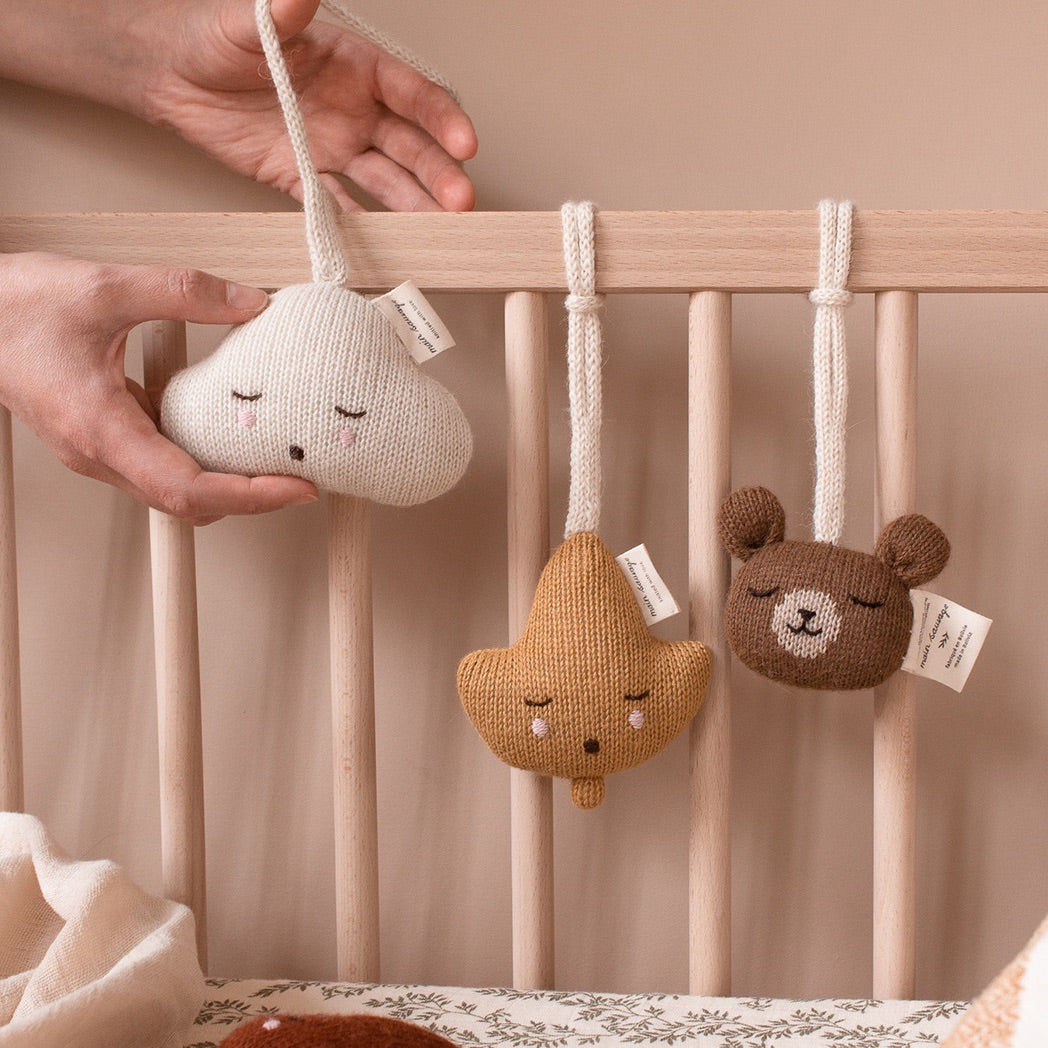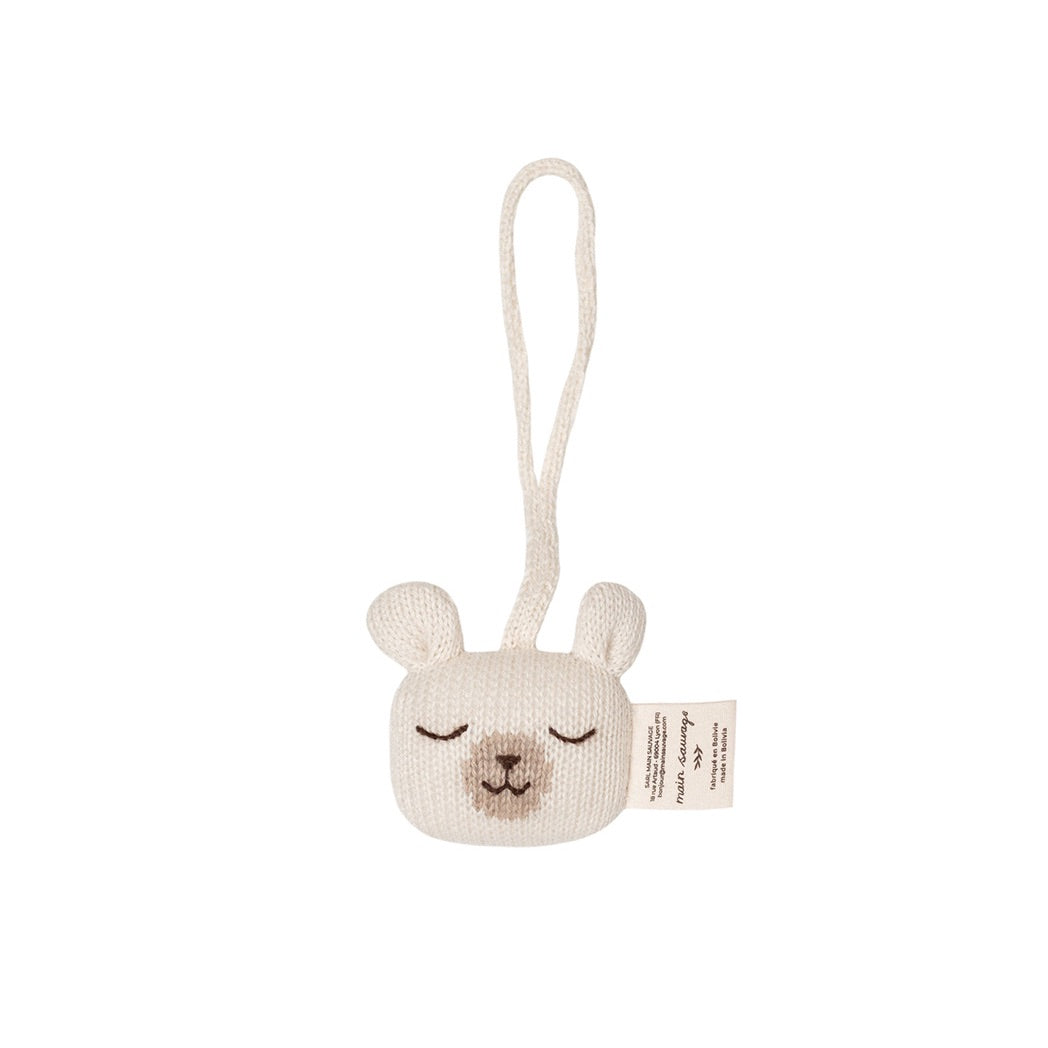 The sweet cuddly toys from Main Sauvage are produced under fair conditions in a small workshop. Knitted polar bear rattle with bell in white for the play arch. With the sweet baby gym rattle, you can play for hours. Material: 100% Baby Alpaca Wool, natural colors Size: 20 cm (hanging) -