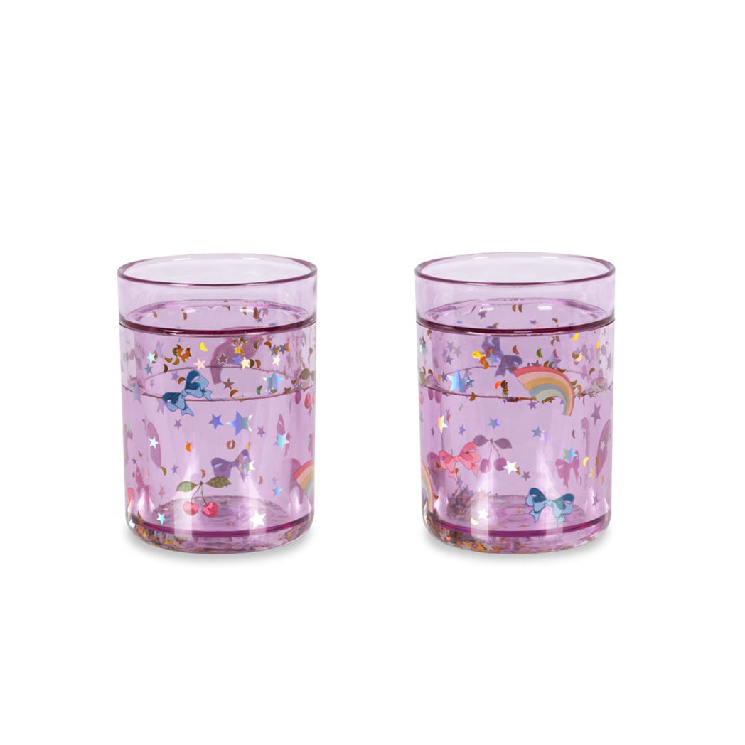 Süsse Glitzerbecher in Lila mit bunter Regenbogen und Maschen-Illustration.