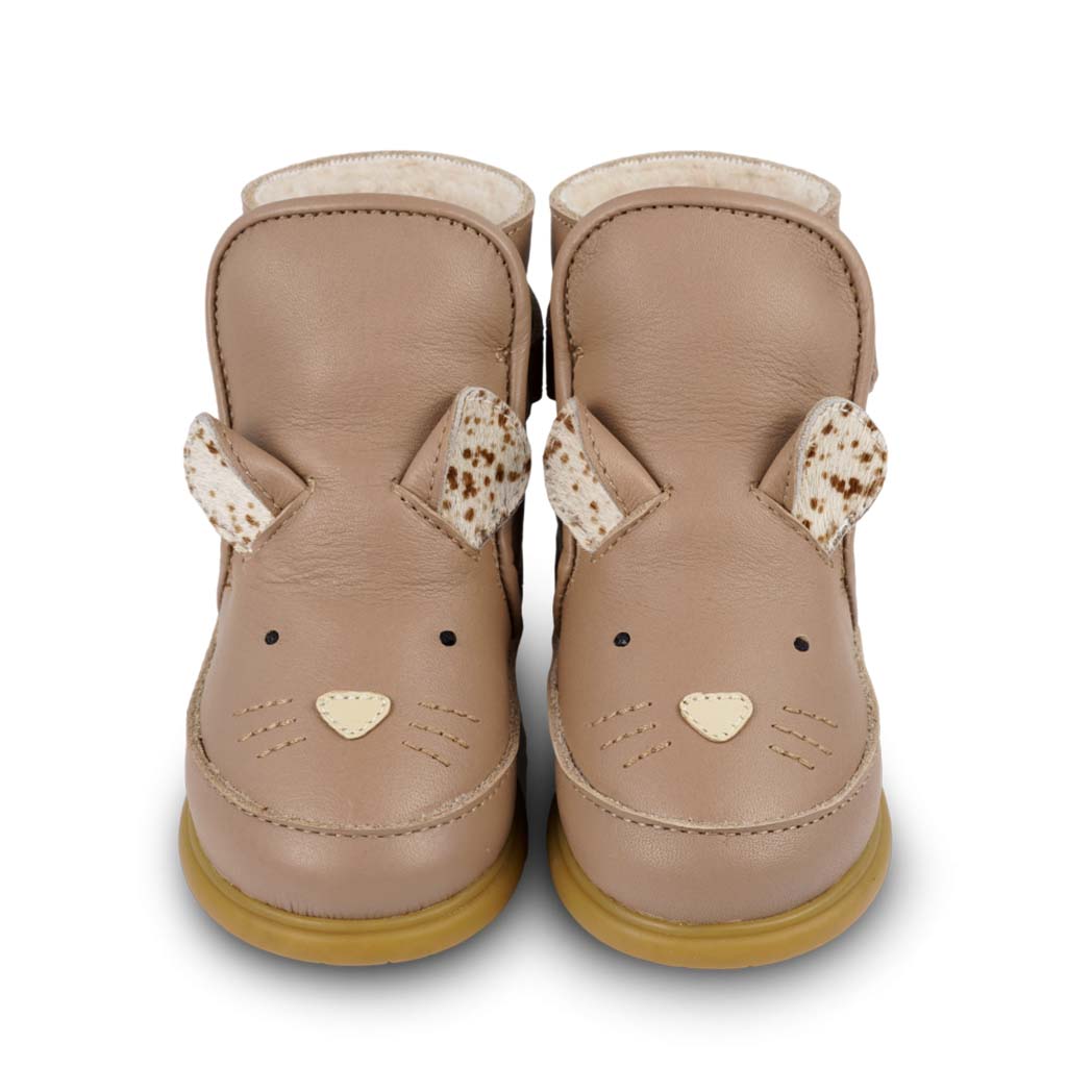 Süsse Stiefeletten aus Leder in Braun mit Maus- Gesicht.