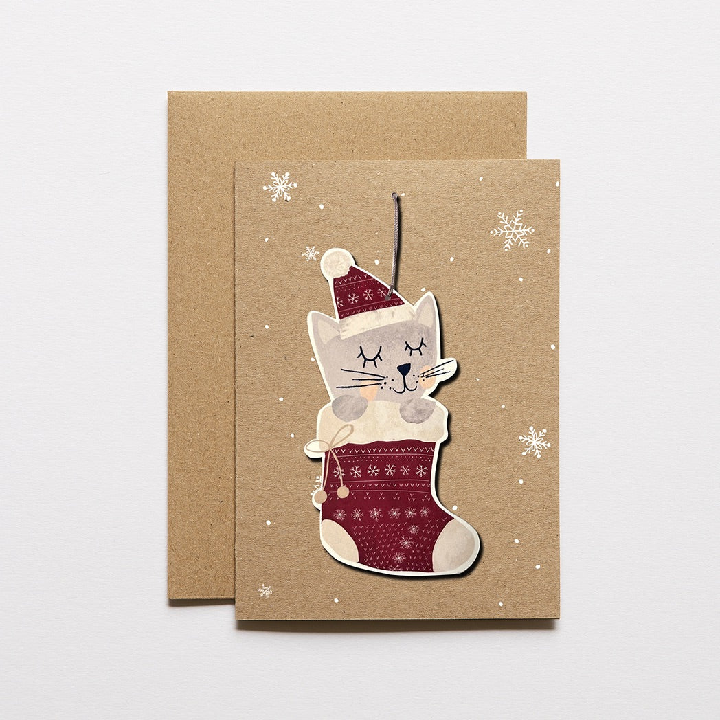 Sandra from Atelier Sasu creates beautiful greeting cards. They are designed and printed in Bern.Greeting card in brown with white snow stars and a cute cat in red stockings as a pendant.