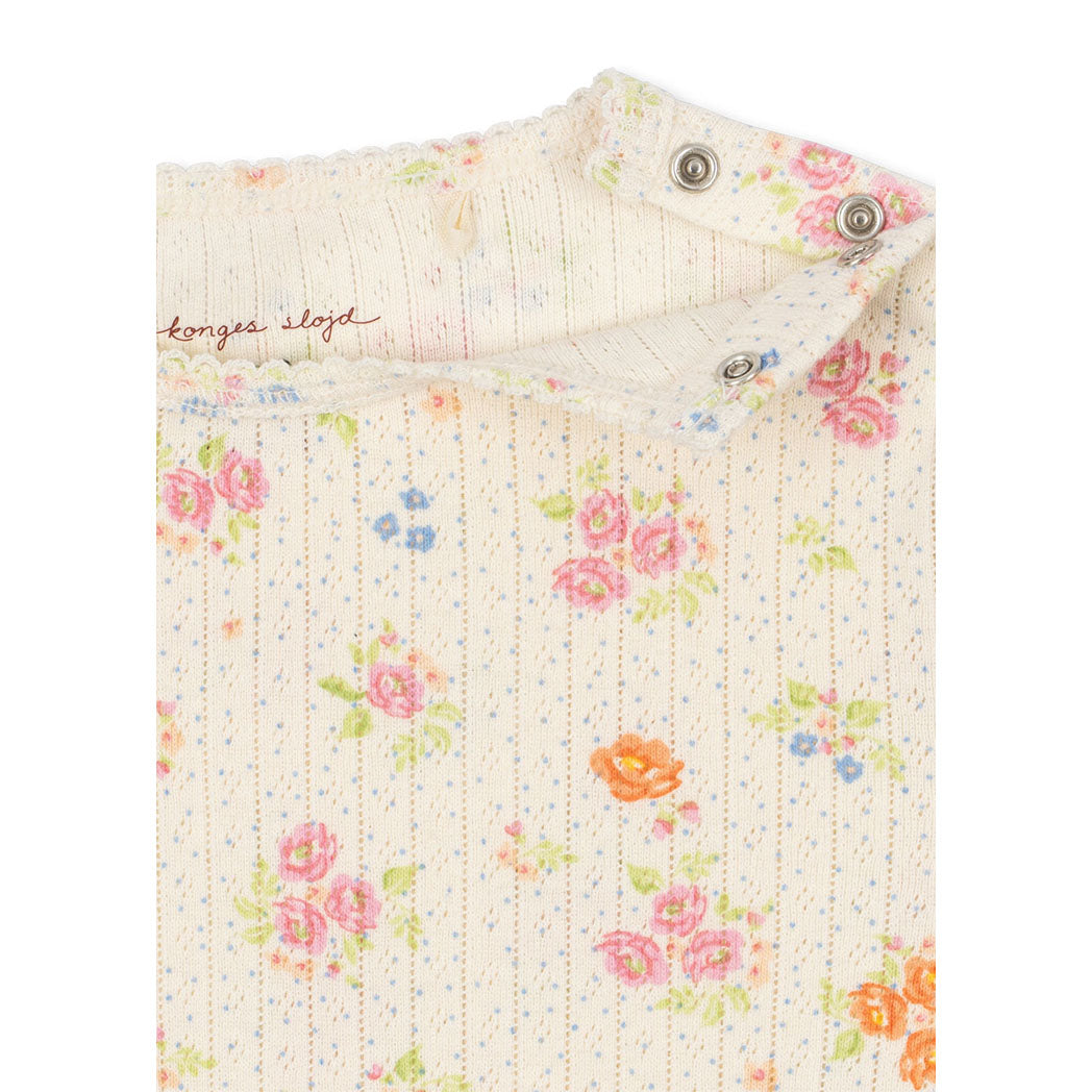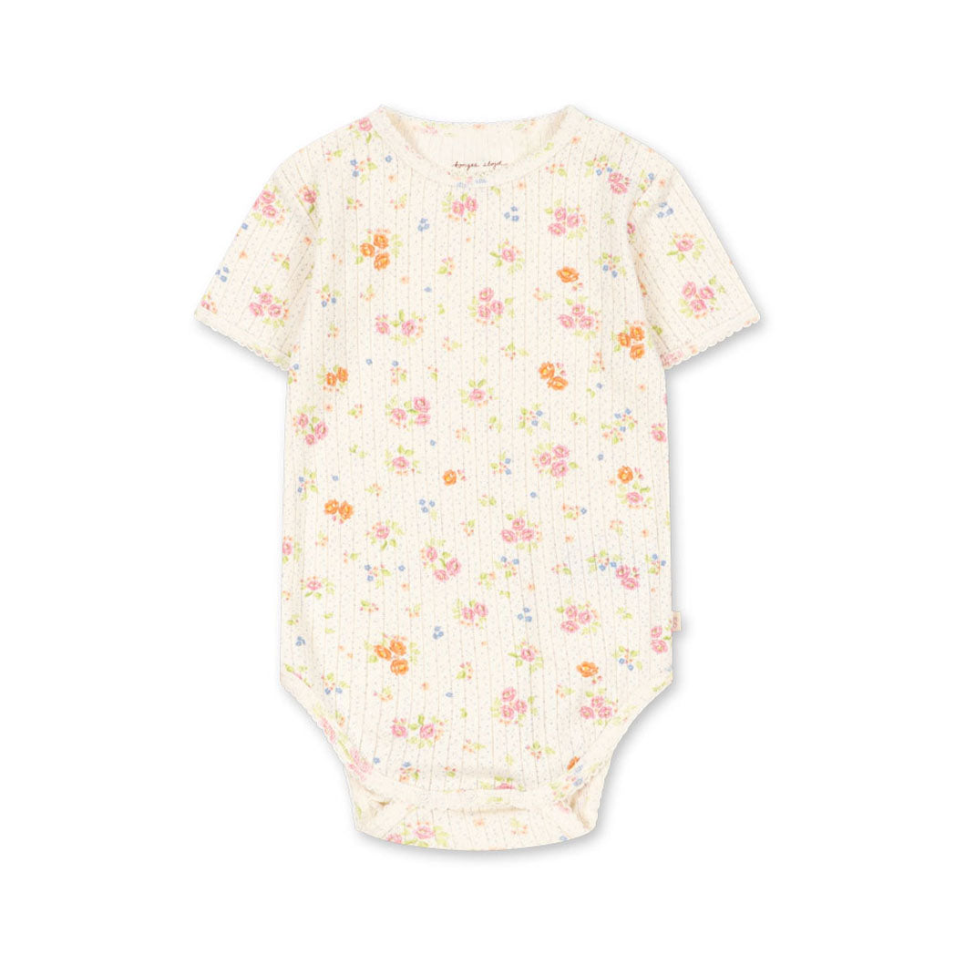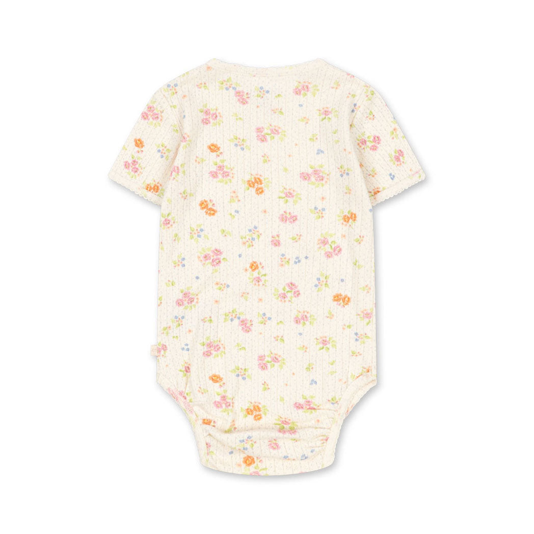 Pretty short-sleeve bodysuit in ecru with pastel-colored floral illustration and pointelle pattern.