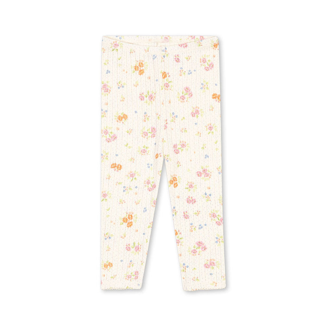 Pretty pants in ecru with pastel-colored floral illustration and pointelle pattern.