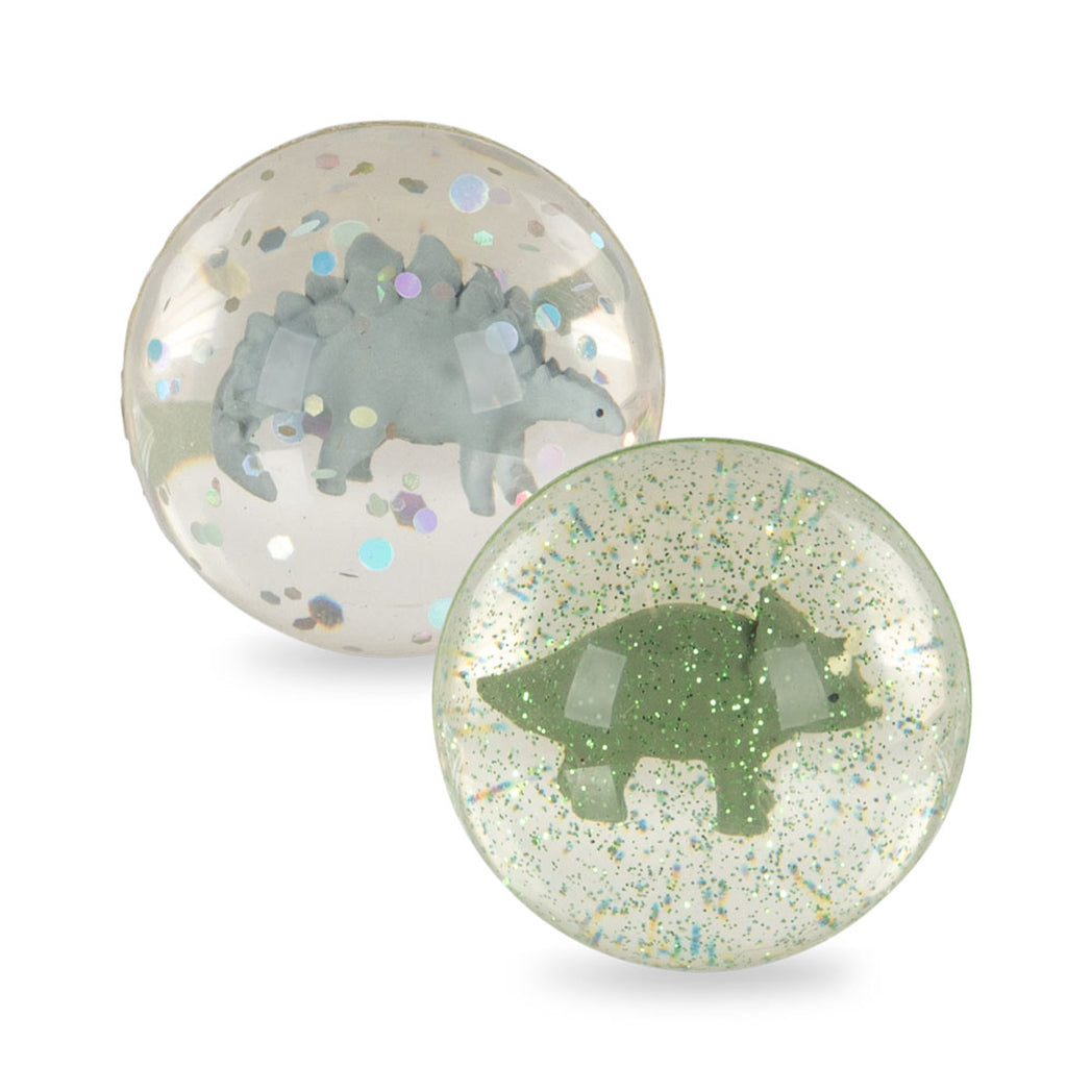 Coole transparente Flummi-Bälle im 2er Pack mit 3D Dino Figuren und Glitzer im Inneren.
