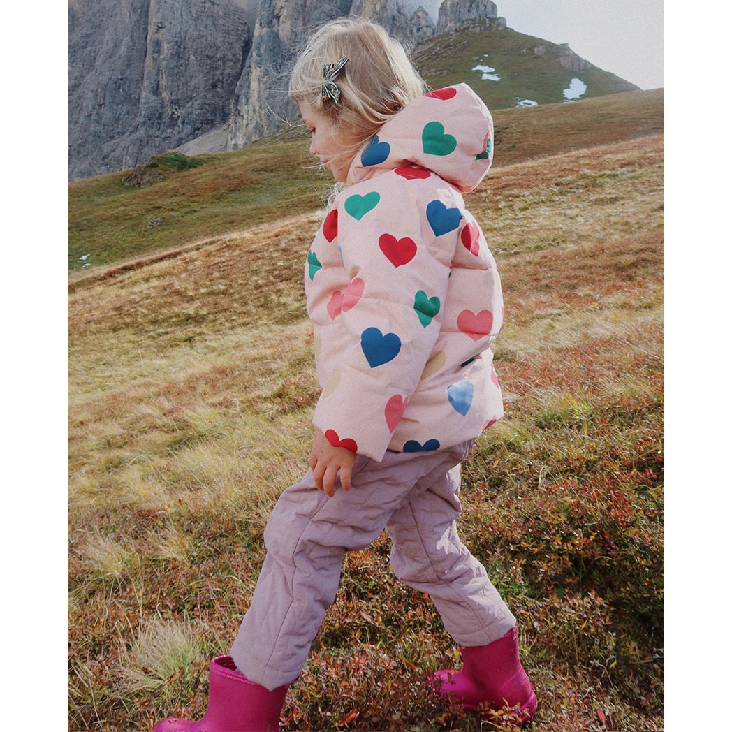 Warme Winterjacke in Rosa mit bunter Herz-Illustration.