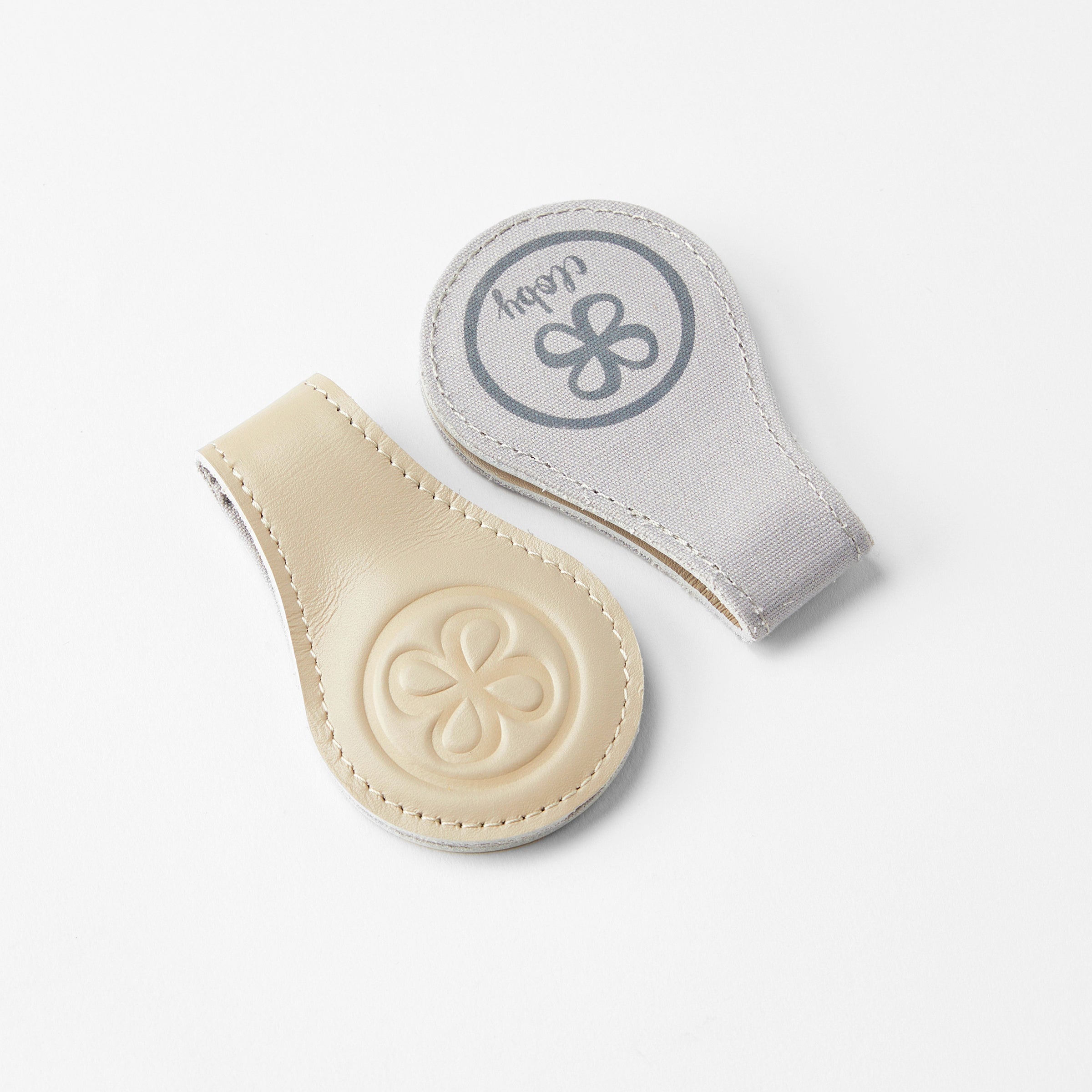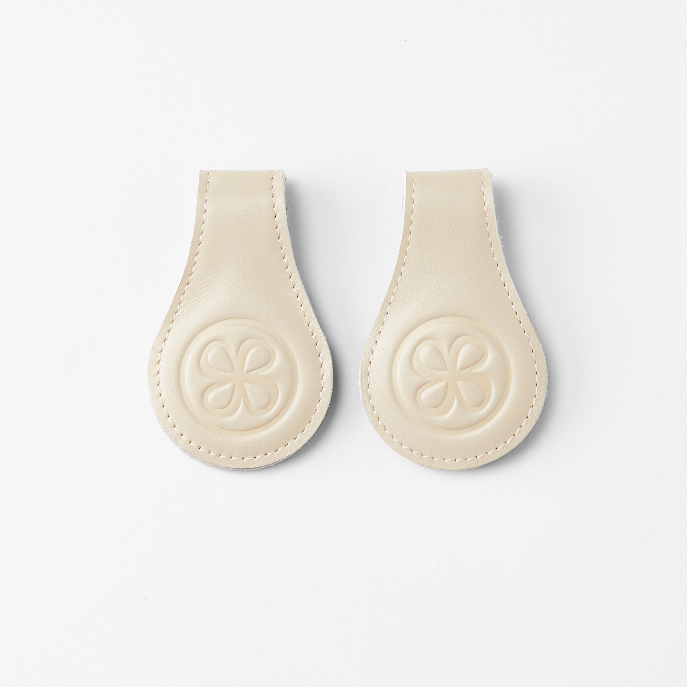 Praktische Magnet Clips für den Kinderwagen aus beigem Leder.