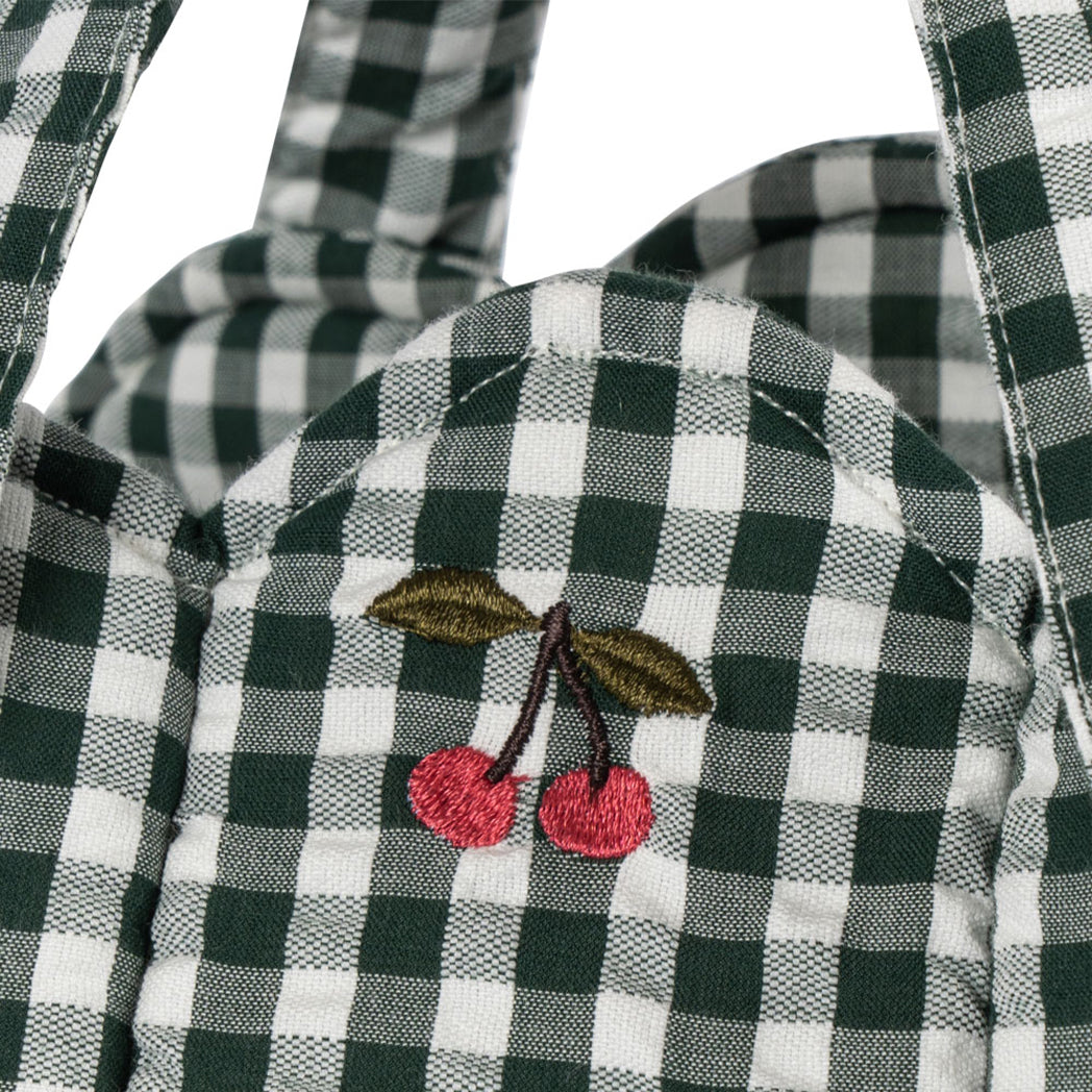 Süsse gepolsterte Puppentasche mit Trageschlaufen in Grün und Weiss kariert mit Kirsch-Illustration.