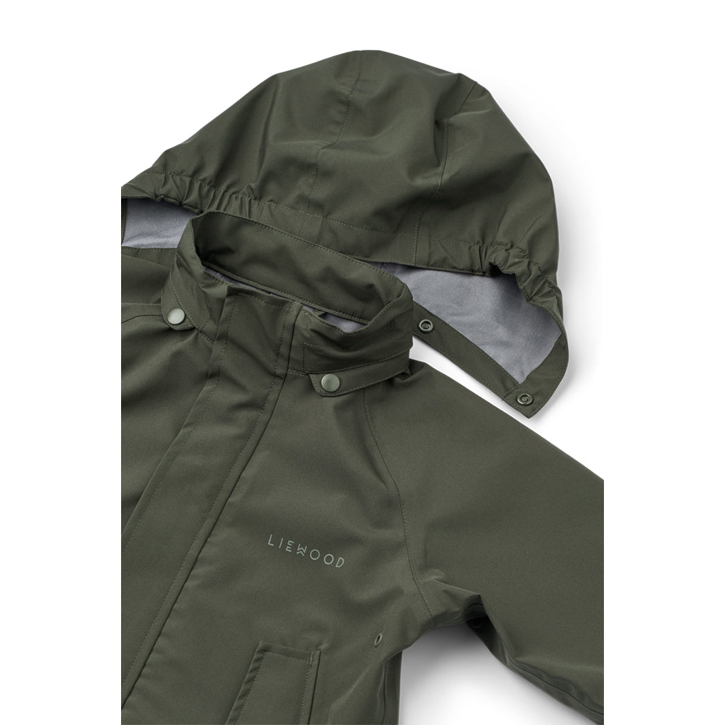 Das Regenset verfügt über zwei Seitentaschen, einen YYK Reisverschluss sowie Druckknöpfe auf der Vorderseite und eine abnehmbare Kapuze, die Regenhose hat einen Gummizug an den Füssen.