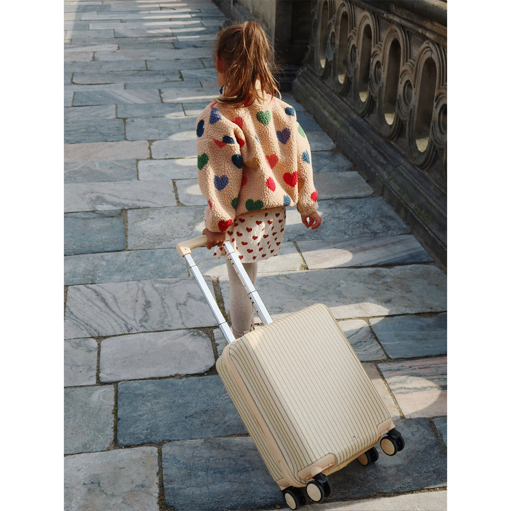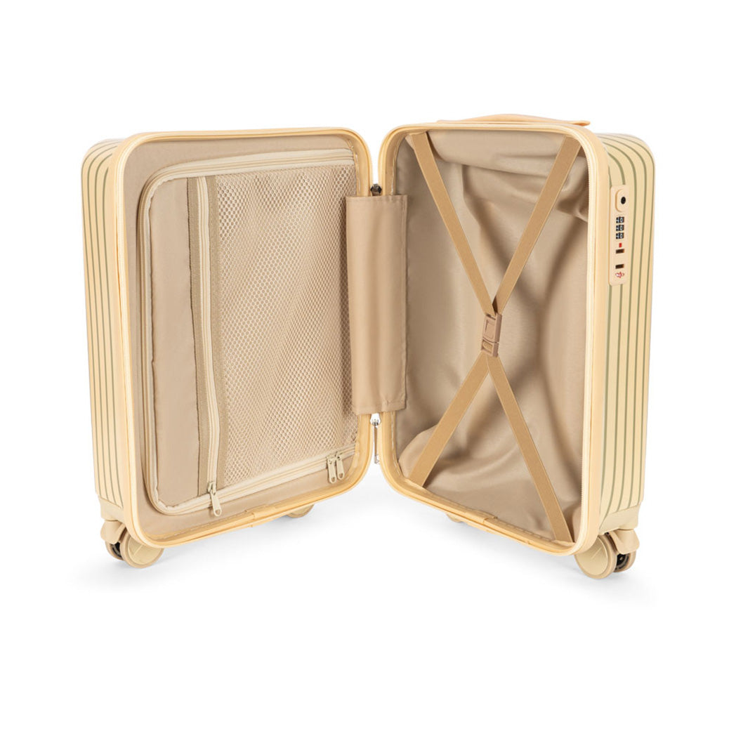 Süsser leichter Kinder Hartschalen-Handgepäck Koffer in Ecru mit Grünen Streifen.