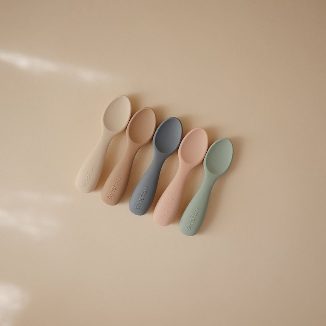 Set aus zwei Silikon Baby Löffeln in Blau und Ecru.