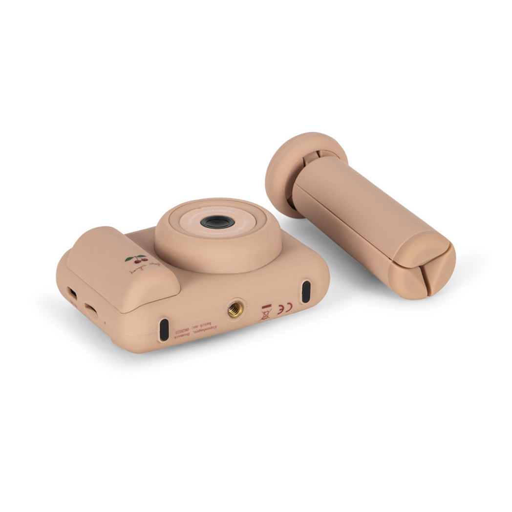 Multifunktionale Digitalkamera in Rosa mit Kirschen-Illustration. Die Kamera enthält einen hochauflösendem Vorschaubildschirm, auf dem Kinder ihre Fotos sofort sehen können. Mit lustiger Selfie-Funktion, Videovoreinstellung und drei vorinstallierten Spielen sowie einem praktischen Tischstativ, das das Aufnehmen von Selfies erleichtert.