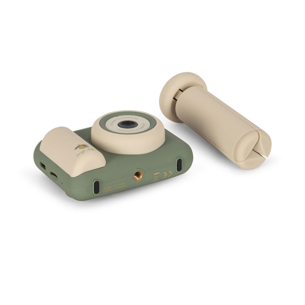 Multifunktionale Digitalkamera in Grün mit Zitronen-Illustration. Die Kamera enthält einen  hochauflösendem Vorschaubildschirm, auf dem Kinder ihre Fotos sofort sehen können. Mit lustiger Selfie-Funktion, Videovoreinstellung und drei vorinstallierten Spielen sowie einem praktischen Tischstativ, das das Aufnehmen von Selfies erleichtert.