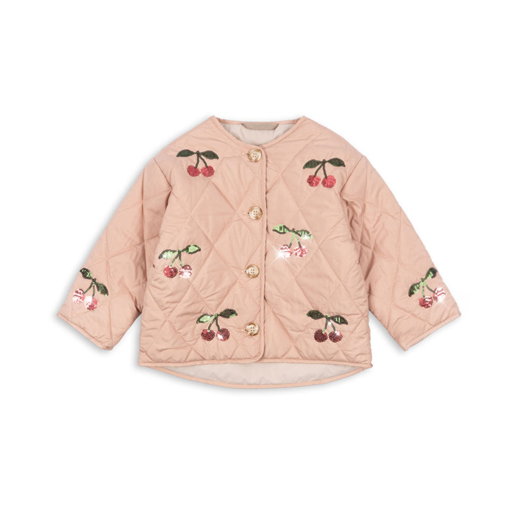 Süsse Steppjacke in Rosa mit Kirschen-Illustration.