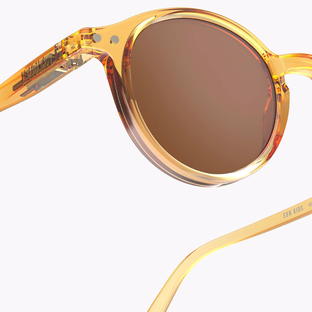 Die Brilenmarke Izipizi möchte möglichst viele Menschen zum Lächeln bringen. Deshalb entwickeln sie Brillen, die bezahlbar sind, die Umwelt schonen und die Augen jederzeit schützen.Süsse runde Sonnenbrille in Sandfarbe mit dunklen Gläsern für 3-5 Jahre.