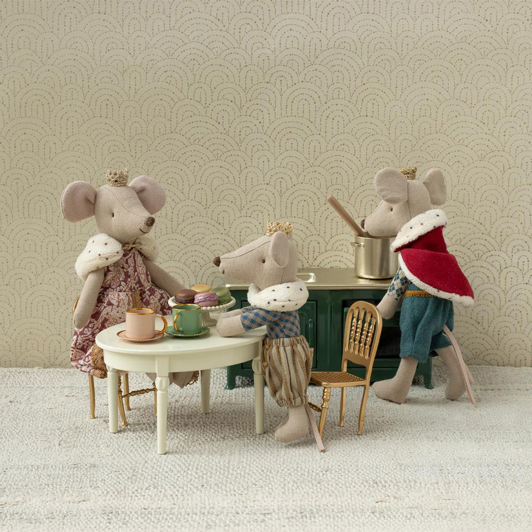 Die Maus trägt blaue Hosen, ein blau/beige kariertes Oberteil, eine goldene Krone und einen Rot/Weissen Umhang. Er passt perfekt in das Schloss Maileg.