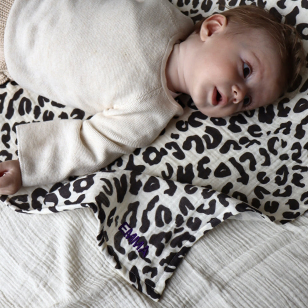 Grosse weiche Nuschi-Decke in Ecru mit schwarzem Leo-Muster.