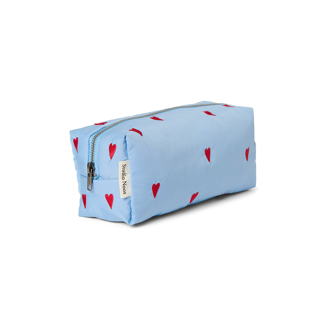 Edles Necessaire in glattem Stoff in Hellblau mit roter Herz-Stickerei.