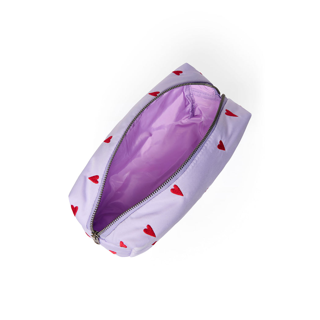 Edles Necessaire in glattem Stoff in Lila mit roter Herz-Stickerei.