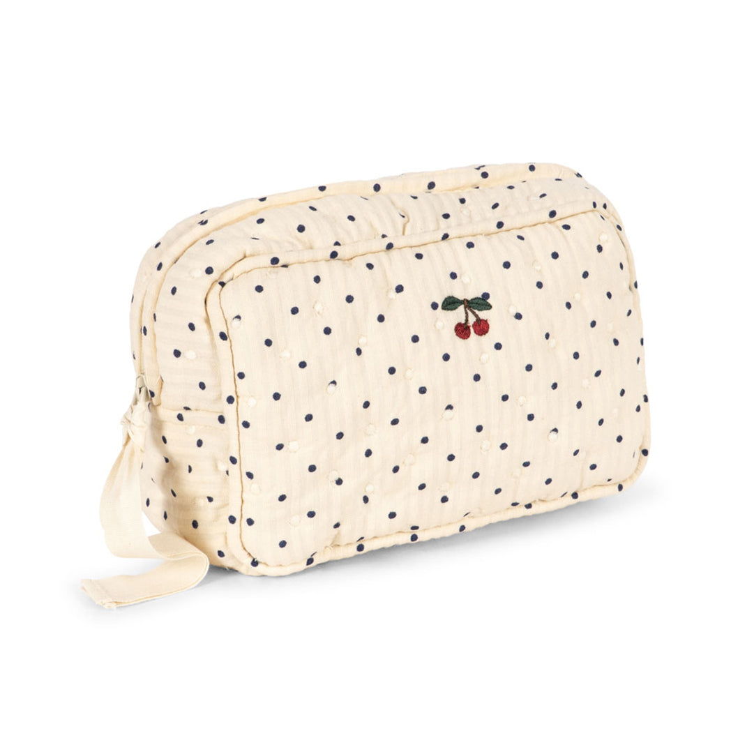 Hübsches kleines Necessaire in Weiss mit blauen Punkten und Kirschen-Illustration. Das Etui verfügt über zwei kleine Fächer mit Reisverschluss.