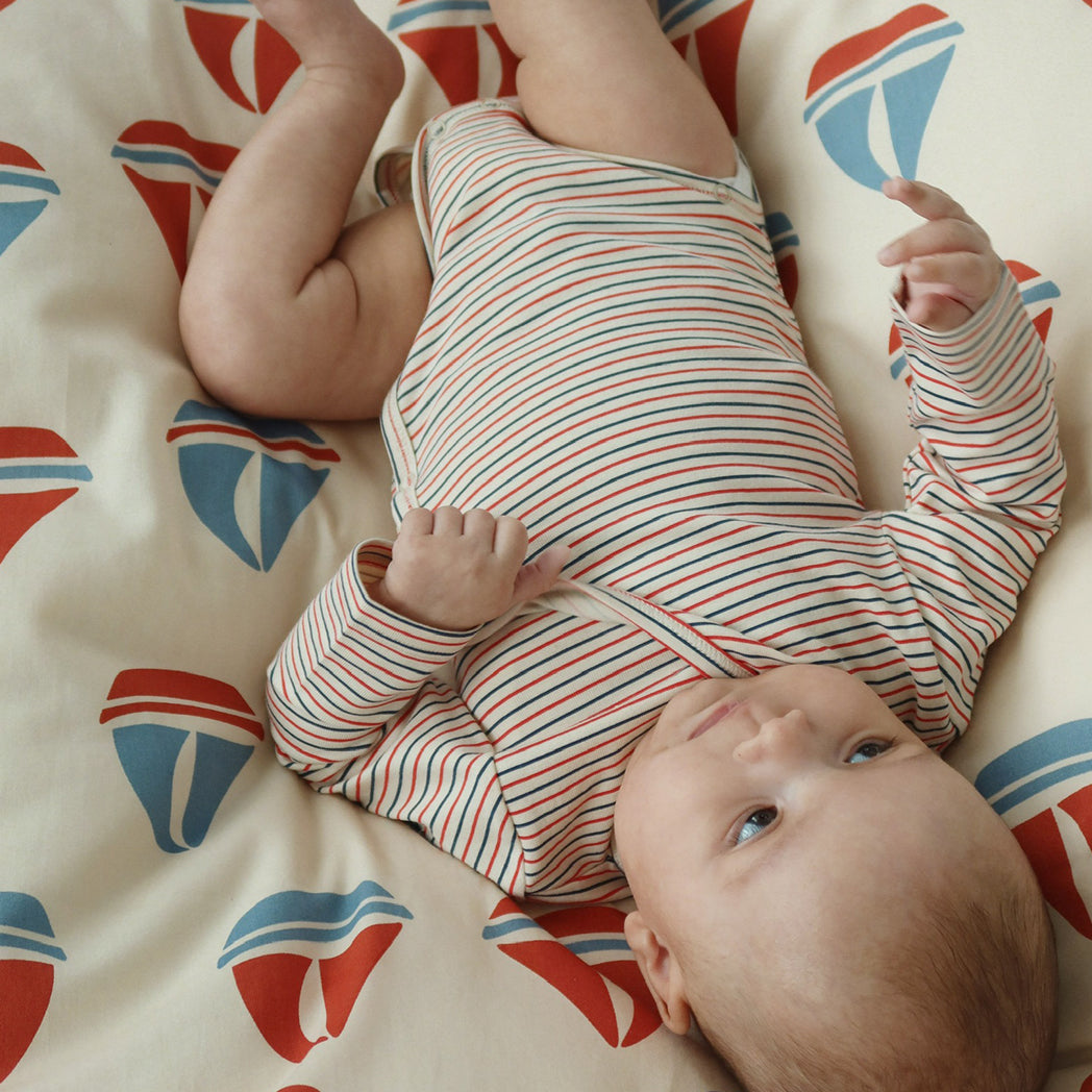 Hübscher gestreifter Langarmbody in Ecru, Rot und Blau.