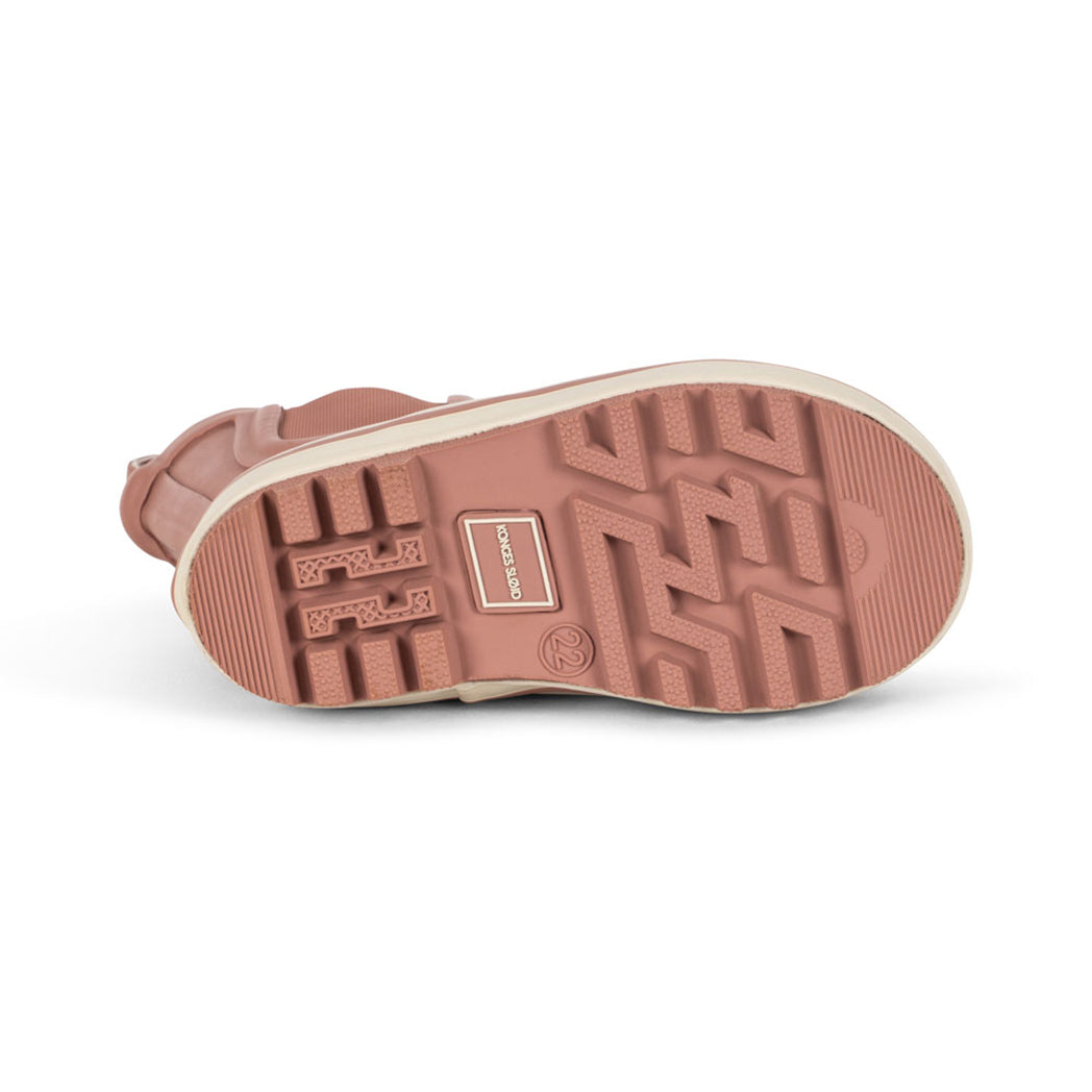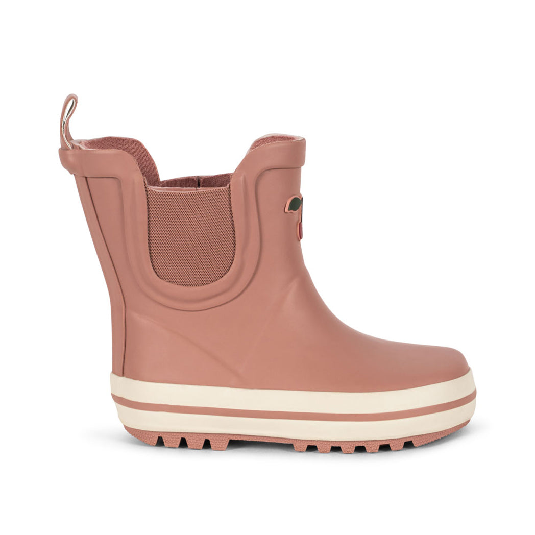 Süsse Gummistiefel Altrosa mit Kirschen-Illustration.