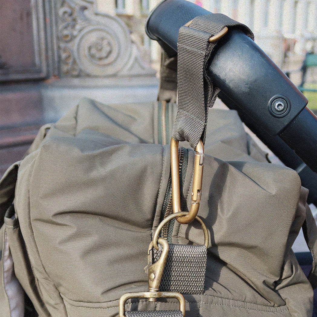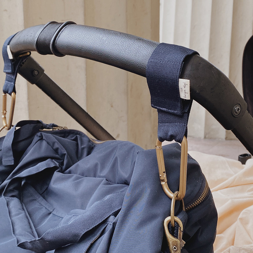 Per Klettverschluss werden sie am Kinderwagengriff befestigt und die Karabinerhaken halten deine Tasche.